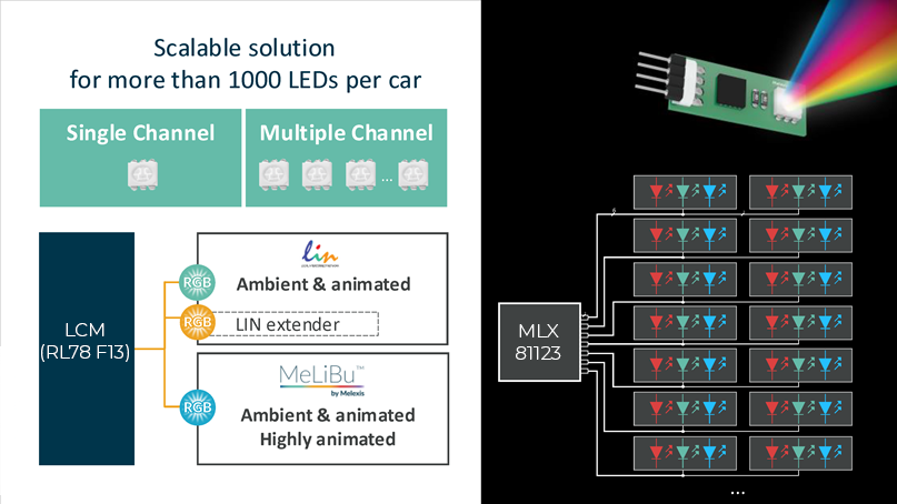The MLX81123 is a fully integrated LIN responder for automotive ambient light applications. It drives RGB LEDs via LIN bus. (according to LIN 2.x as well as SAE J2602). The MLX81123’s integrated physical layer LIN transceiver, LIN protocol controller, and current-controlled outputs enable rapid development of straightforward yet effective and economical ambient light modules for LIN bus systems.