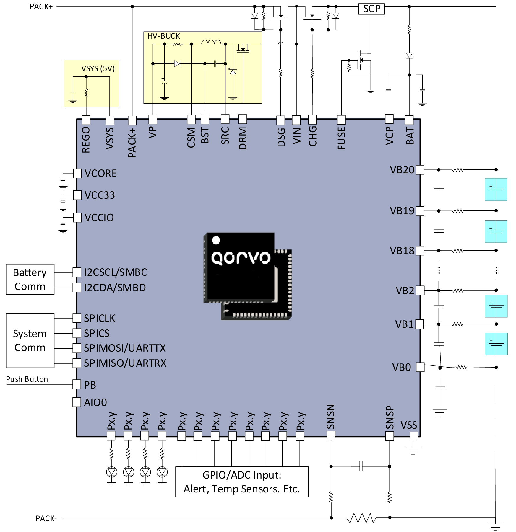 The Qorvo® PAC22140 is a Smart Battery Monitoring System (BMS) that can monitor 10-series to 20-series Li-Ion, Li-Polymer and LiFePO4 battery packs. The PAC22140 integrates a FLASH-programmable MCU, Power Management, Current/Voltage/Temperature Sense and drive circuits for charge/discharge FETs and protection fuses. It can communicate using UART/SPI or I2C/SMBus serial interfaces.