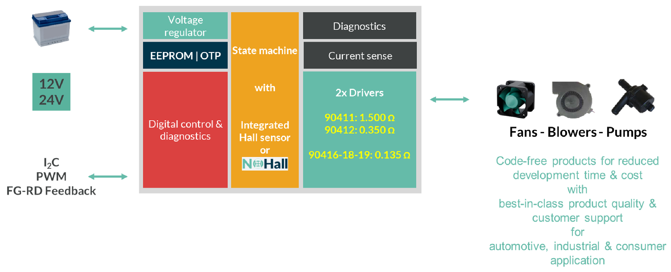 The MLX90412-K operates over a supply voltage range from 3.5 V to 32 V, and is robust up to 40 V, With a current limit up to 2.2A, the MLX90412 can drive applications up to 35 W in a safe way without risk of overheating the device or the motor coil. The closed-loop speed control and adaptive low noise commutation enable industry-standard efficiency with lowest acoustic noise.