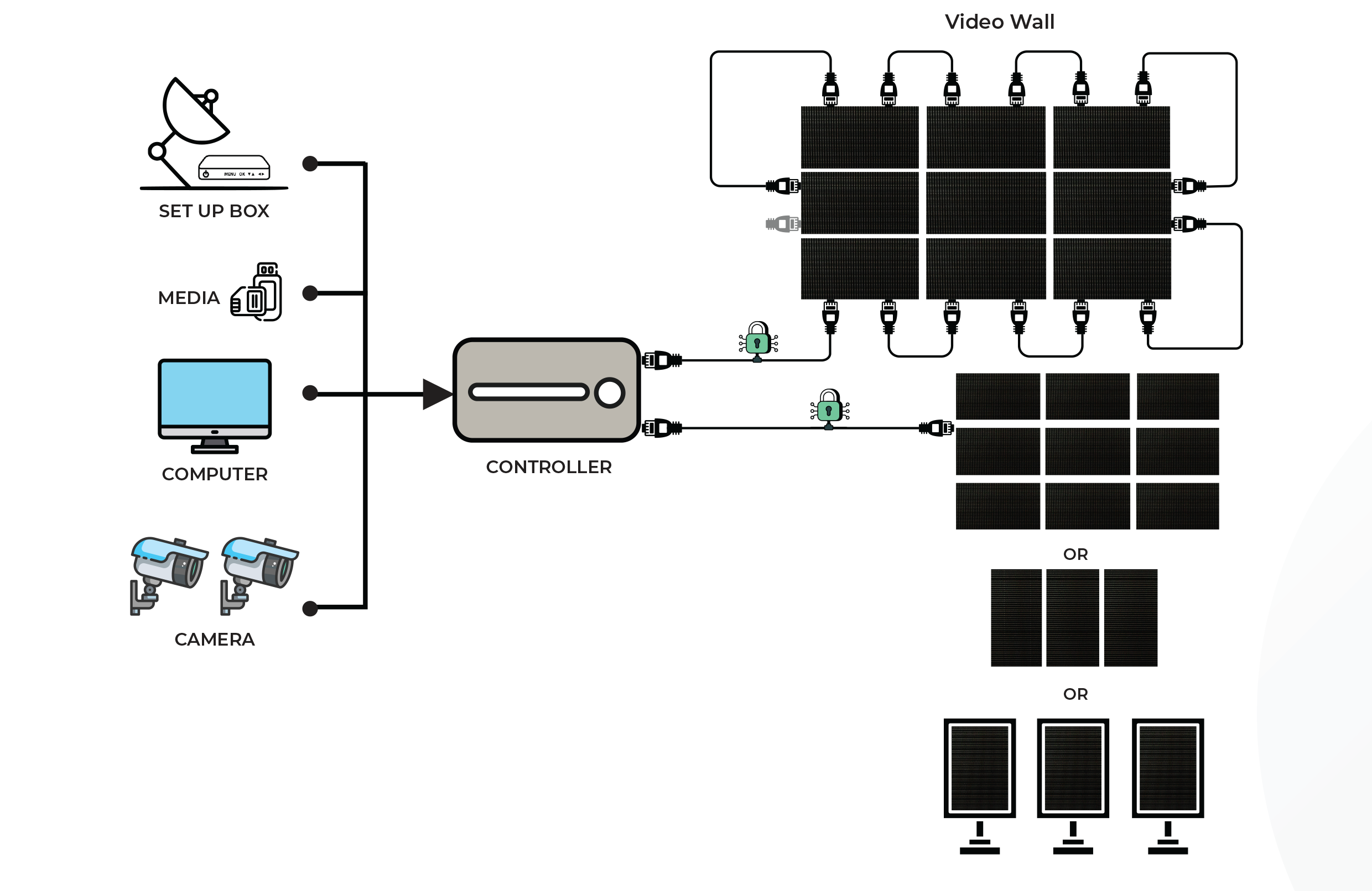 Typical Video Wall usage involves Video Controllers with HDMI – our solution does not need HDMI – our solution uses Ethernet in daisy chain.